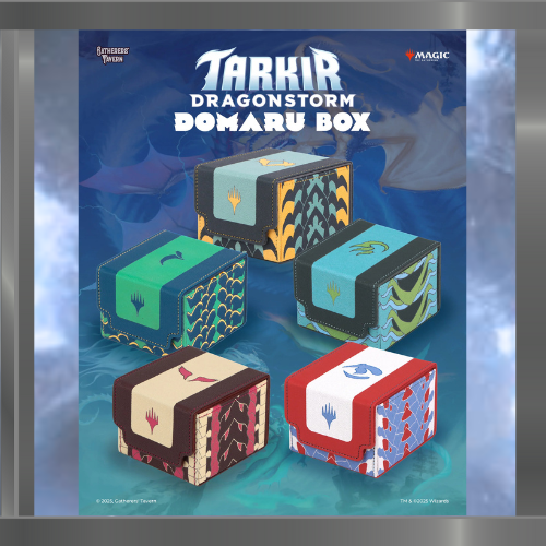 Inspired by the strength and elegance of Japanese armor, DOMARU, meaning chest armor or body wrap, is our series designed to provide your cherished collection with the best protection it deserves. May this DOMARU Box become a trusted companion as you enlist it into your gaming journey. Product Features: Tarkir: Dragonstorm Inspired Design: Featuring textured scale patterns of the five dragons, the Tarkir: Dragonstorm DOMARU Box is the perfect way to showcase your love for the set. Spacious Storage: Whether you're a seasoned player or just starting out, this box offers ample space, accommodating over 130 double-sleeved cards or 100 triple-sleeved cards. Perfect for storing your deck, sideboard, or extra cards, the roomy interior ensures you're always prepared. Card Dividers: Each DOMARU Box includes two dividers with alternating top tabs, making it easy to organize and separate your cards efficiently. Strong Magnetic Closure: Your deck deserves the best protection. That's why the DOMARU Box is equipped with powerful magnets, ensuring a secure and reliable closure.